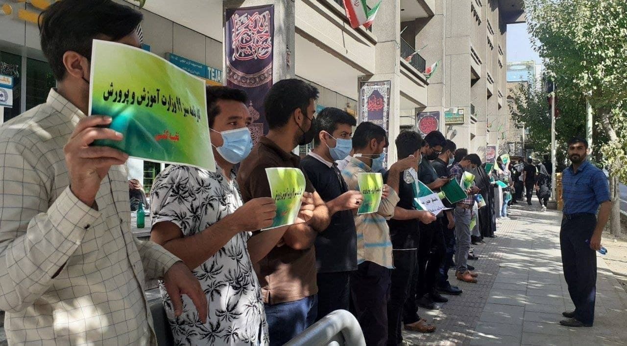 بهپێی ڕاپۆرتهكان، ناڕازییان به مانگرتنی شهوانه له بهرانبهر بینای وهزارهتی ئامووزش و پهروهرشی تاران خوازیاری دامهزراندن لهو وهزارهتخانهیه و جێبهجێ كردنی داخوازییهكانیان بوون . شایانی باسه مۆعهلیمانی ناسراو به كارنامه سهوزهكان له ساڵی ڕابردوو ههتا ئێستا به بهڕێوهبردنی چهندین جار كۆبوونهوهی ناڕهزایهتی خوازیاری ڕوونكردنهوهی چارهنووسی پیشهییان بوون بهڵام ههتا ئێستا له لایهن هیچ بهرپرسێكی ڕژیم وڵامی داخوازییهكانیان نهدڕاوهتهوه .