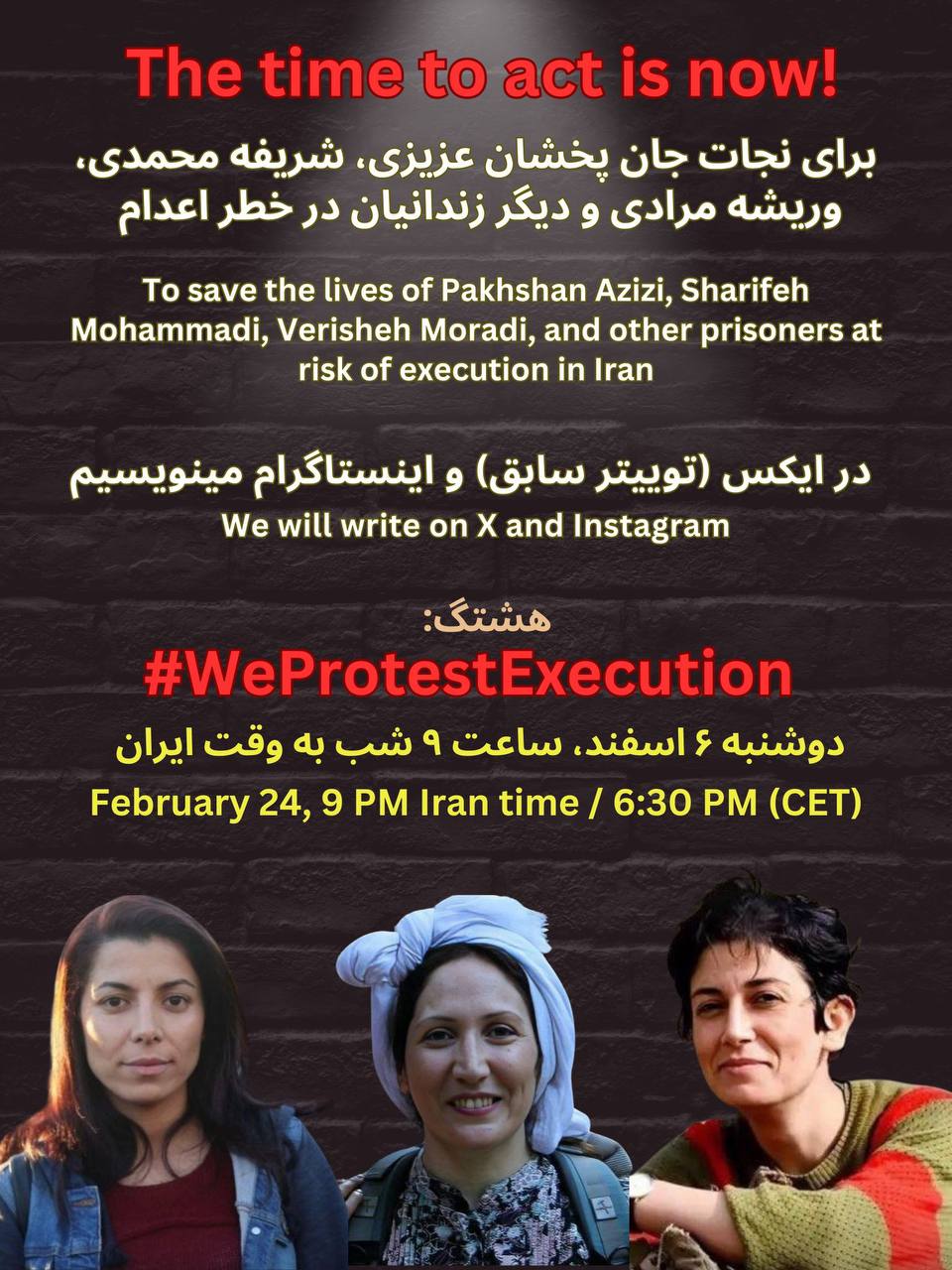 بهپێی ئهو ڕاگهیاندنه، ڕۆژی دووشهممه كاتژمێر ٢١ به كاتی ئێران و ١٨ و ٣٠ خولهك به كاتی ئورووپای ناوهندی گهردهلوولی تویتهری بۆ ڕزگاركردنی گیانی پهخشان عهزیزی، وریشه مورادی و شهریفه محهممهدی له پهتی سێداره دهست پێدهكات. چالاكانی مافی مرۆڤ ڕایانگهیاند: له ساڵی ٢٠٢٤ی زاینی دا كۆماری ئیسلامی به لانیكهم ٩٤١ كهسی لهسێداره داوه و ئهگهر ئهمانهوێت كۆتایی به حوكمی نامرۆڤانهی ئێعدام بێنین ئهبێ یهكگرتووانه بهشداری له كهمپهینهكانی دژ به سێداره بكهین.