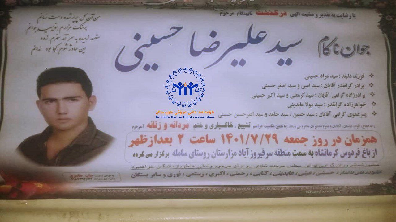 ڕۆژی چوارشهممه ٢٧ی مانگی ڕهزبهر، لاوێكی خهڵكی كرماشان به ناوی “سهید عهلیڕهزا حسێنی” لهكاتی خۆپێشاندانهكانی ئهو شاره به تهقهی هێزهكانی ڕژیم گیانی بهختكرد.