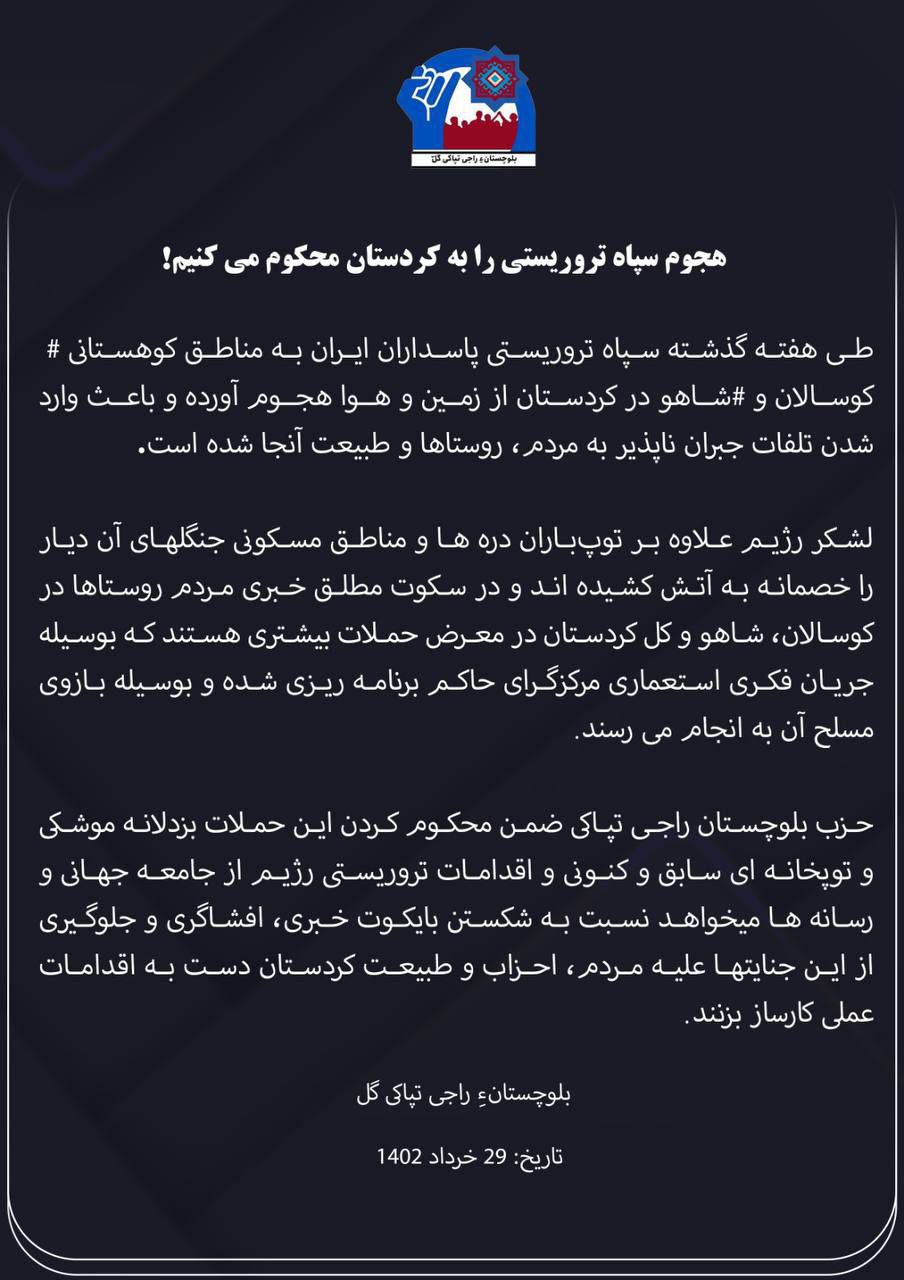 ڕۆژی سێشهممه ٣٠ی جۆزهردان، حیزبی “بهلووچستان ڕاجی تهپاكی” له بهیاننامهیهك دا هێرشهكانی سپای پاسدارانی بۆ سهر كوردستان به توندی شهرمهزار كرد.