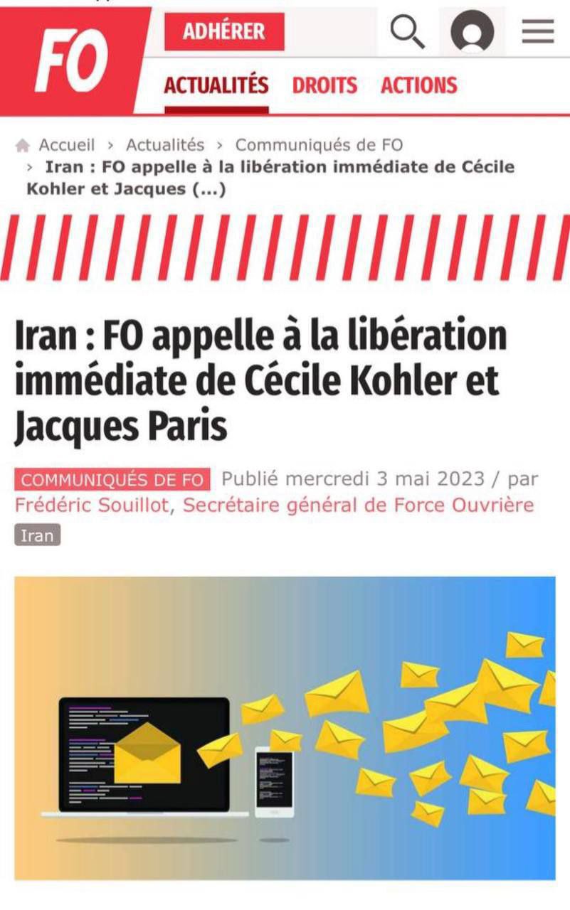 له بهشێكی ئهو بهیاننامهیهدا هاتووه، بهندكرانی “سیسیل كۆهلر” و “ژاك پاری” له سهفهرێكی شهخسی و لهكاتی پشوودانی بههاری ئێران، وڵاتێك كه لهمێژ بوو دهیانویست سهردانی بكهن ڕوویداوه. دهستبهسهركرانی ئهو دوو چالاكه مهدهنیه بهبێ هۆكار و به شێوهی نایاسایی به توندی ئیدانه دهكهین و ڕایدهگهینین كه ئهو دوو هاوكاره تهنیا به بیانووی ئهندام بوونیان له كۆنفدراسیۆنی كاری فهڕانسه دهستبهسهركراون و ئهبێ دهستبهجێ ئازاد بكرێن.
