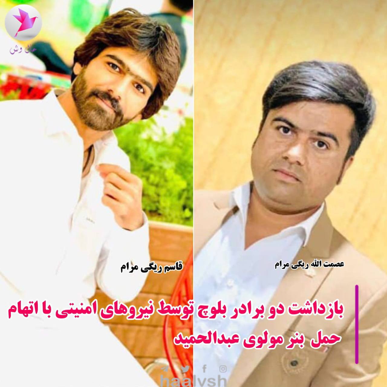 ڕۆژی چوارشهممه ٧ی مانگی پووشپهڕ، دوو هاووڵاتی بهلووچی خهڵكی زاهیدان به ناوهكانی “عێسمهتۆڵڵا ڕیگی مهرام” تهمهن ٢٥ ساڵ و “قاسم ڕیگی مهرام” تهمهن ٢٠ ساڵ به بیانووی لایهنگری كردنی مهولهوی “عهبدۆلحهمید” لهلایهن ناوهنده ئهمنیهتیهكانهوه دهستبهسهر كران.