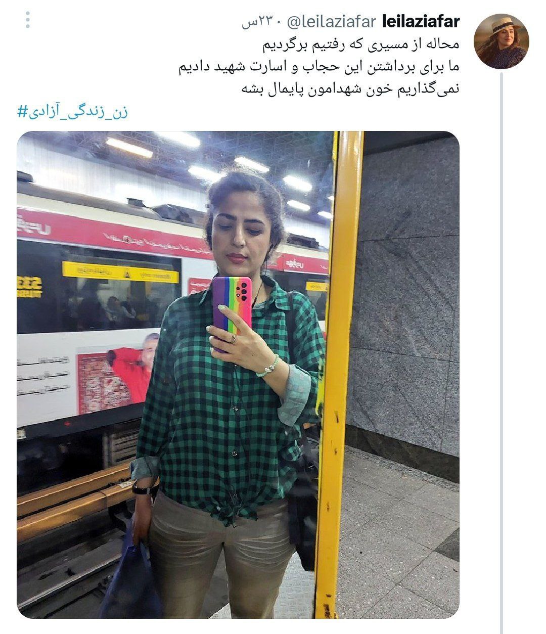ژنێك له‌ یه‌كێك له‌ شه‌قامه‌كانی شاری گونبه‌دی كاڤووس له‌ ئوستانی گوڵستان سه‌رپۆشه‌كه‌ی تۆڕ دا و هاواری كرد ئازادی، به‌ڵام له‌لایه‌ن هێزه‌كانی حكوومه‌ته‌وه‌ به‌ توندووتیژی و بێڕێزی ده‌ستبه‌سه‌ر كرا. له‌لایه‌كی دیكه‌وه‌ هێزه‌ ئه‌منیه‌تیه‌كانی تاران هێرشیان كرده‌ سه‌ر ماڵی “له‌یلا زیافه‌ر” بێژه‌ری ته‌له‌فزیوون و موعه‌لیمی شێوازی وتوووێژ و ناوبراویان ده‌ستبه‌سه‌ر كرد. جێگای ئاماژه‌یه‌ كه‌ “له‌یلا” پاش كومه‌ڵكوژكردنی خه‌ڵك له‌ خه‌زه‌ڵوه‌ری ٩٨ هاوكارییه‌كانی له‌گه‌ڵ ڕادیۆ و ته‌له‌فزیوونی ڕژیم قه‌تع كرد و له‌ شۆڕشی “ژینا” حیجابی ئیجباری تۆڕ دا و پشتیوانی له‌ خه‌ڵك كرد.