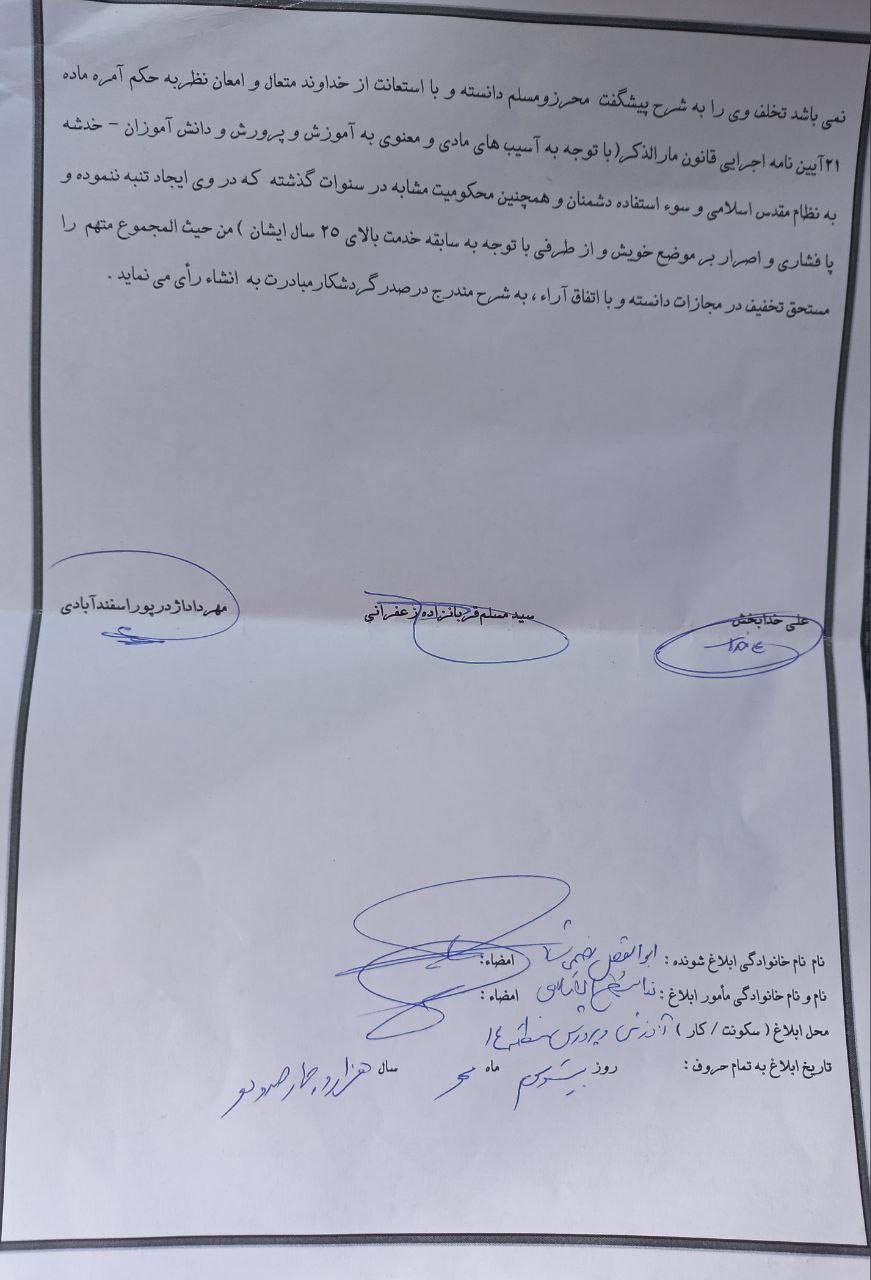 له ڕۆژانی ڕابردوودا، خوێندكارێكی زانكۆی بهههشتی تاران به ناوی “محهممهدنهوید بادامی” به یهك ساڵ زیندان و ٧٤ زهربه شهلاق مهحكووم كراوه، ههروهها چالاكێكی سنفی فهرههنگیانی ئێران به ناوی “ئهبۆلفهزل ڕهحیمی شاد” لهلایهن ئامووزش و پهروهرشهوه، به خانهنشینی ئیجباری و كهمكردنهوهی پلهی ڕیزبهندی سزا دراوه.