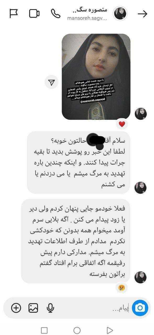 “مهنسووره سهوگهند” له ئهكاونتی ئینستاگرانی خۆی له هاشتەگی “سیتهم نامێنێت” كهڵكی وهرگرتبوو و نووسیبوو: ” سلاو بۆ هاونیشتمانیانم، من “مهنسووره سهوگهوند” خهڵكی ئوستانی لوڕستان و شاری خۆڕهم ئاوام. من ئهندامی خۆبهخشی هێزه ئینتزامییهكانی خۆڕم ئاوا بووم. لهم كاتهوه هیچ جۆره هاوكارییهك لهگهڵ هێزه چهكدارهكانی كۆماری ئیسلامی ناكهم و لهگهڵ هاونیشتمانیانم دهمێنمهوه”. ناوبراو له دوایین ستووری خۆی له ئینستاگرام باسی له ههڕهشهی ناوهنده ئهمنیهتیهكان كردبوو و ڕایگهیاندبوو كه ئهگهر گیانی له دهستدا خهڵك بزانن كه لهلایهن ئیدارهی ئیتلاعاتهوه كوژراوه و خۆكوژی نهكردووه.
