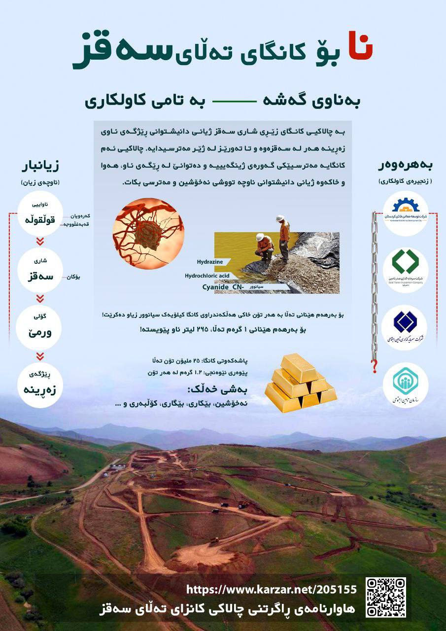 چالاکانی ژینگەیی سەقز بە بڵاوکردنی پۆستەری ئاگادارکردنەوە، داوای ڕاگرتنی چالاکیی کانگای زێڕی سەقزیان كرد و ڕایانگهیاند: چالاكییهكانی ئهو مهعدهنه مەترسیی جیددی بۆ سەر ژینگە و ژیانی دانیشتووانی ڕێژگەی ئاوی زەڕینە لە سەقزەوە تا تەورێز، دروست کردووە. چالاکییهكانی ئەو کانگایە مەترسییەکی گەورەی ژینگەییە و لە ڕێگەی ئاو، هەوا و خاکەوە دانیشتووانی ناوچەکە تووشی نەخۆشی دهكات. لهو پۆستهره ههروهها ئاماژه به پاشهكهوتی ٢٥ ملیۆن تۆنی زێڕی ئهو كانگا و پشكی خهڵكی ناوچهكه كه نهخۆشی، بێكاری و كۆڵبهرییه كراوه.