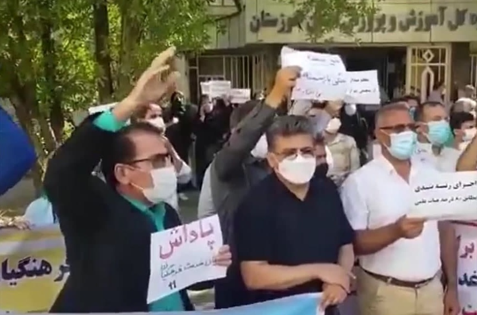 کۆمەڵێک لە مۆعەلیمان و کارمەندانی ئامووزش و پەروەرش و خانەنشین کراوانی ئەو وەزارەتە لە پارێزگاکانی ئیسفەهان، ئازەربایەجانی شەرقی، فارس، ئەلبۆرز، کۆهگیلوویە و بوویرئەحمەد، خووزستان، کرماشان و ئیلام، ڕۆژی شەممە ٢٧ی مانگی خەرمانان لە بەرانبەر بینای گشتی ئامووزش و پەروەرشی پارێزگاکانیان کۆبوونەوە.